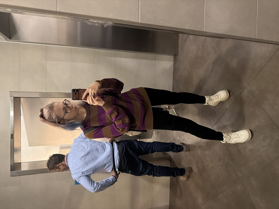 - "A woman with purple and brown striped sweater, black leggings and white sneakers takes a mirror selfie in a public restroom" by FM-0Olrx1, licensed under CC BY 4.0