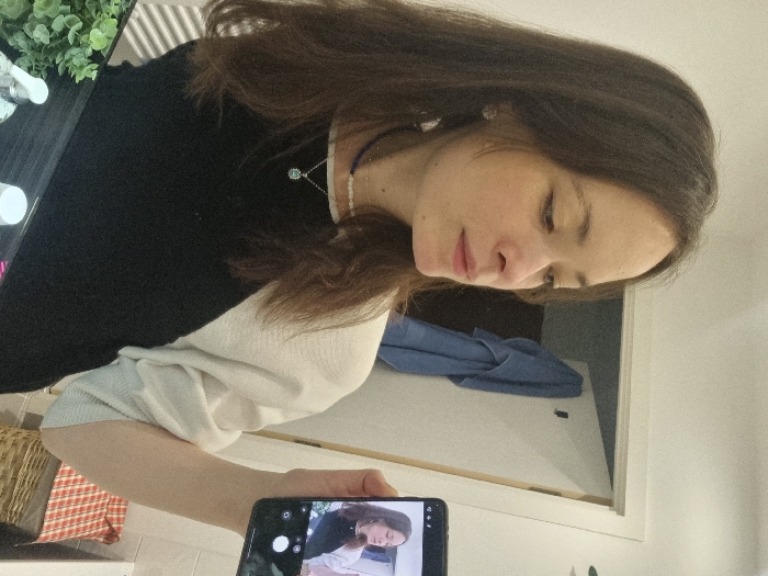 - "A female subject with long brown hair, wearing a black and white long-sleeved top, two necklaces (one beaded choker, one silver chain with a circular pendant), and stud earrings, holds a black smartphone in her right hand" by FM-8F8Xp1, licensed under CC BY 4.0