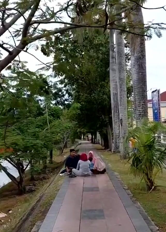 A medium shot shows a group of four people sitting on a paved walkway. Three of the people are wearing hijabs. The walkway is lined with tall palm trees on one side and a grassy area with a body of water on the other. The sky is overcast.