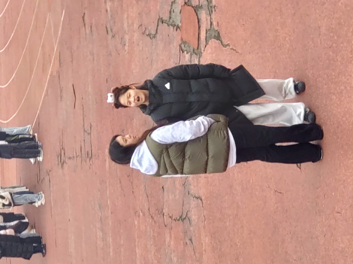 Two women lie on a red, cracked surface, one on top of the other. The top woman wears a black puffer jacket and light-colored pants, with her mouth open. The bottom woman wears a green vest over a white hoodie and black pants. Part of a group of seated people is visible on the left side of the frame. A faded running track is nearby. The surface appears to be concrete.