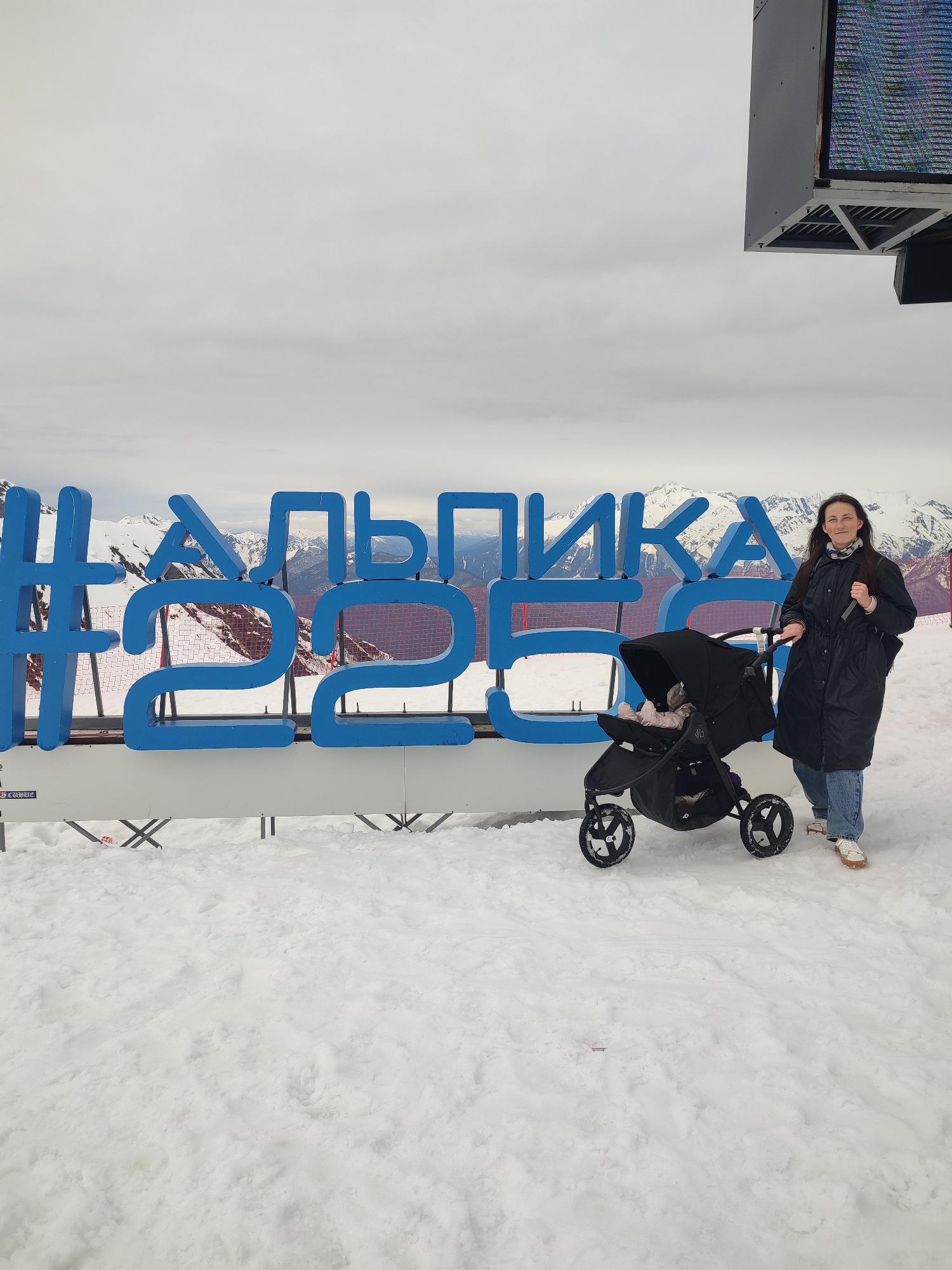 A woman stands next to a black baby stroller in a snowy environment. Behind her is a large blue sign that reads "#АЛЬПИКА2256". In the background, snow-covered mountains are visible. The location is in Estosadok, Russia. Above and to the right is a portion of a digital display or sign structure. The woman wears a long black coat, blue jeans, and light-colored shoes, and she has a backpack on her shoulder. The stroller is fully covered with a dark covering.