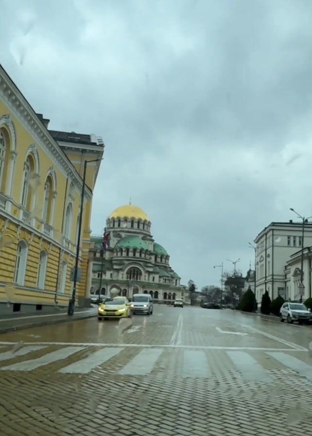 The view from inside a vehicle looks down a straight, wet cobblestone street toward a large Orthodox church with a gold dome
