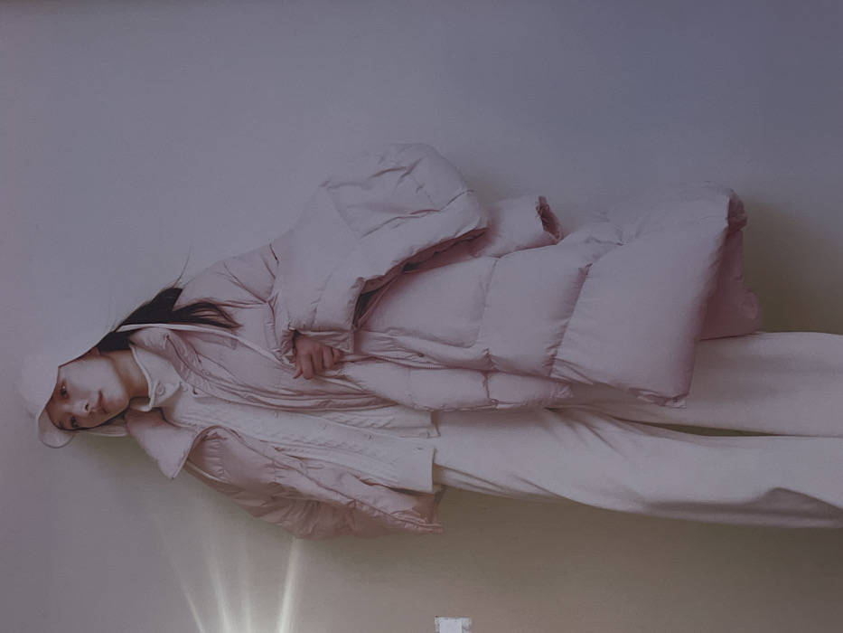 A full-length photograph, taken in the Chongqing High-tech Zone, China, depicts a young East Asian female. She stands facing slightly left, with her head subtly turned to the right and her gaze directed forward. She is attired in a light pink cropped puffer jacket, worn over a cream-colored cable-knit turtleneck sweater and an underlying lighter-toned, possibly buttoned, garment. Her lower body is clad in cream-colored wide-leg trousers. A matching light pink cap with ear flaps covers her head, with dark hair visible beneath it over her left shoulder. She holds a second, larger light pink puffer jacket draped over her bent left arm. The background consists of a plain, light beige wall, illuminated by a distinct light source originating from the left, creating a soft sheen on the wall surface.