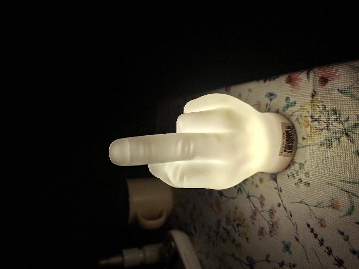 - "A translucent, frosted white lamp shaped like a human hand extending its middle finger emits a warm, yellowish-white light" by FM-YQydj1, licensed under CC BY 4.0