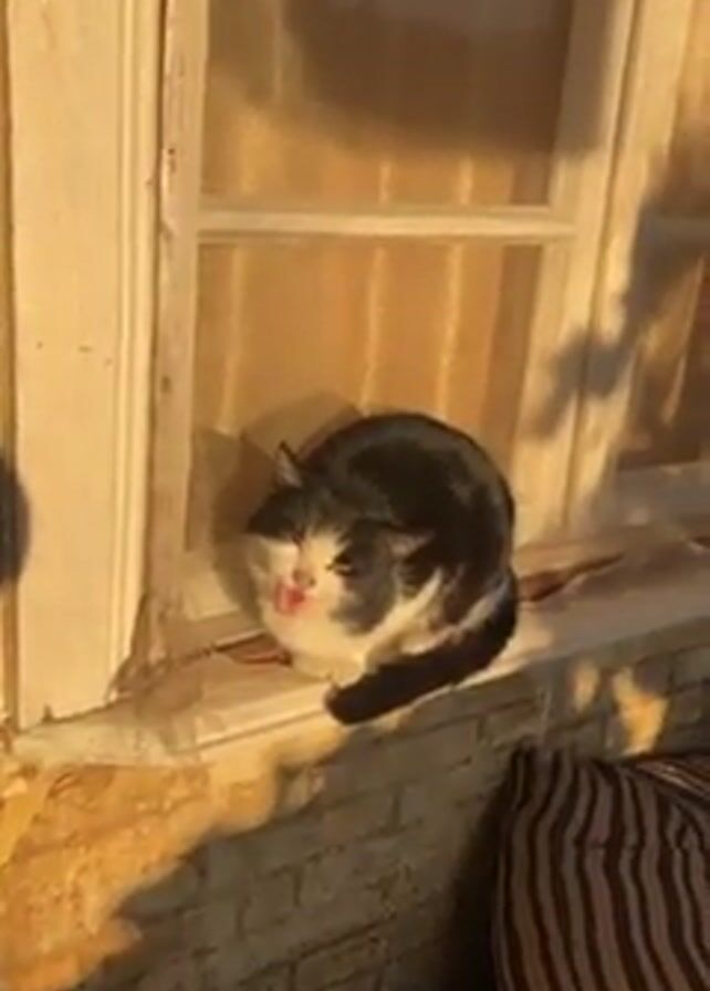 A black and white cat sits on a window sill, its eyes closed. The cat is bathed in warm sunlight, and its shadow is cast on the brick wall below. The cat meows. A striped pillow sits on a couch next to the window.