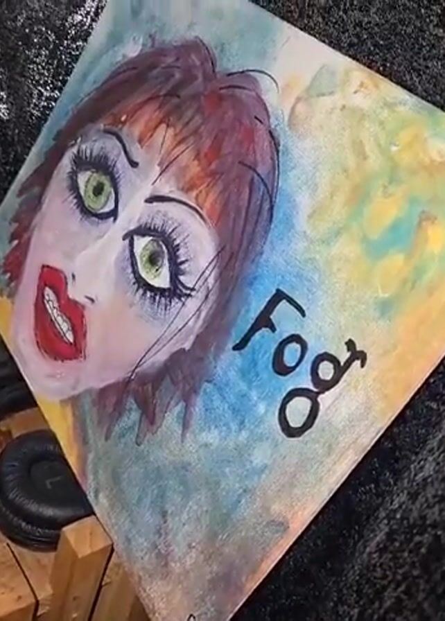 close-up view of a painting. The painting is on a square canvas. It depicts a woman's face with exaggerated features: large green eyes, long eyelashes, pale skin, and red lips with visible teeth. The hair is a mix of red and brown tones. The background of the painting is a blend of blue, yellow, and green colors. The word "Fog" is written in black to the right of the face. The canvas sits on a wooden surface, next to a black lamp, headphones, and other miscellaneous items.