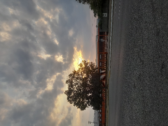 The image captures an outdoor scene in Tinaquillo, Venezuela, at either sunrise or sunset, indicated by a prominent golden-orange glow on the horizon breaking through an overcast sky. The sky is largely covered by dark gray and white clouds, with areas of light filtering through. The foreground consists of a dark, granular paved surface, likely asphalt, displaying faint white dashed lines on the right side. A large, dark-leaved deciduous tree stands silhouetted against the bright horizon in the left-center midground. Behind the tree, a lengthy industrial or commercial facility is visible, characterized by a series of orange-brown vertical panels or slats forming a fence-like perimeter. White horizontal structures are discernible behind these panels. Utility poles and overhead lines are present on the far left. On the far right, a partial view of a small, rectangular white sign with dark text is visible. No individuals, animals, or active vehicles are present within the frame.