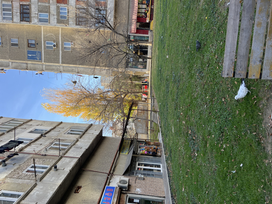 This image captures an urban residential scene in Tbilisi, Georgia, characterized by multi-story concrete buildings flanking a central green space under a clear blue sky. The environment is a courtyard or park area, primarily green grass interspersed with dry leaves. In the foreground, a white pigeon with black speckles walks rightward on the grass, while a darker grey pigeon is further back. A partial wooden bench is visible in the bottom right. The season appears to be late autumn, marked by a tall, slender tree with vibrant yellow foliage located in the mid-ground, alongside several other bare-branched deciduous trees. Two weathered multi-story concrete buildings define the scene. The building on the left features numerous white-framed windows and visible laundry drying on lines extending from upper floors. Its ground level houses a "Pharmacy" identified by a blue sign bearing Georgian script ("სააფთიაქო") and an adjacent shop with a grey awning. The building on the right is also a multi-story concrete structure with multiple windows, some equipped with air conditioning units. A blue "One Way" street sign with Georgian text ("ერთი მიმართულებით") is affixed to its upper facade. Its ground floor contains commercial establishments, including one with a dark storefront and another with a red awning, where indistinct human figures are present. Laundry lines are visible extending between the buildings. A red vehicle is partially visible in the distant background beyond the trees.