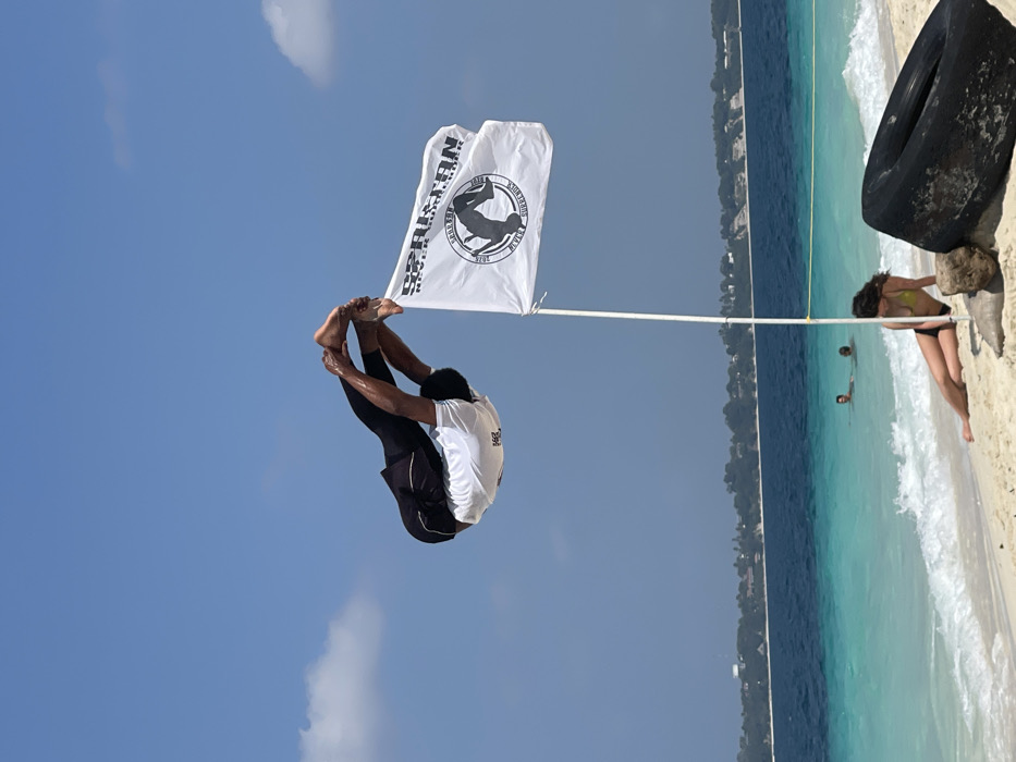 The image portrays a sunlit tropical beach scene in Zanzibar, Tanzania. In the upper left quadrant, a male individual, dressed in a white t-shirt and dark athletic pants, is suspended mid-air, performing a tightly tucked acrobatic maneuver with his bare feet and hands visible near his shins. To his right, a white flag affixed to a pole displays a black circular logo featuring a silhouetted figure and the text "SPARTAN NEVER SURRENDER," along with "THE DIVINE SURRENDERS." On the white sand beach in the lower right foreground, a woman with dark hair, wearing a yellow bikini top and dark bottoms, is seated or reclined. A large black tire lies on its side near the woman and the flag pole. The ocean in the midground exhibits a gradient of color, from clear turquoise near the shore, where small waves break, to a deep blue further out. Two individuals are partially submerged in the turquoise water, appearing to be swimming or wading. A distant landmass, characterized by a shoreline with green vegetation and structures, is visible across the deep blue water under a clear blue sky with sparse white clouds.