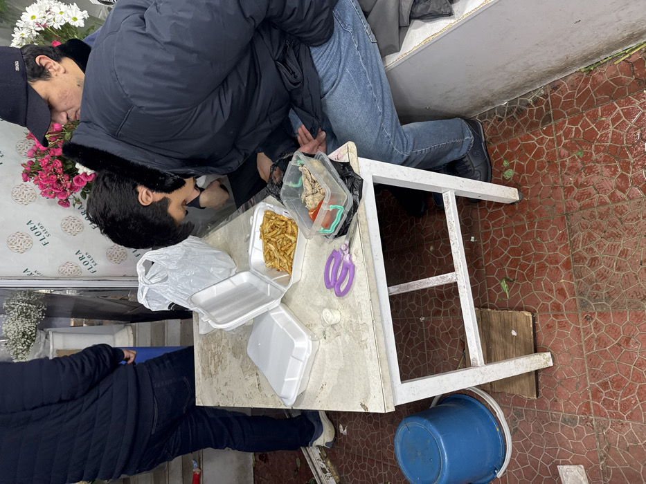 The image depicts an indoor scene at a "FLORA SALON" in Tashkent, Uzbekistan, likely a flower shop or a related work area. Three adult males are present. In the immediate foreground, a man wearing a dark puffy jacket with a fur-lined collar and blue jeans is seated on a low surface, leaning forward over a rectangular white table with a worn surface. He is positioned to the right of the table, facing the left. Another man, partially visible behind him, wears a black baseball cap and a dark jacket, looking towards the left side of the frame. To the far left, a third man stands with his back to the viewer, wearing a dark quilted jacket and dark jeans. On the table, several items are visible: an open white Styrofoam container holding french fries, a closed white Styrofoam container, a clear plastic food container with a green lid containing what appears to be shredded meat and red vegetable pieces, a small white plastic cup, a pair of purple-handled scissors, and a crinkled white plastic shopping bag. The floor is tiled with reddish-brown geometric patterns, appearing damp and exhibiting scattered green plant debris, suggesting a workspace where flowers are handled. An inverted blue plastic bucket is positioned near the front left leg of the table, which rests on a small piece of wood. The background features white walls adorned with "FLORA SALON" branding and decorative floral motifs, along with various flower arrangements including pink roses and white chrysanthemums or daisies. A dirty, light-colored ledge runs along the bottom of the right wall.