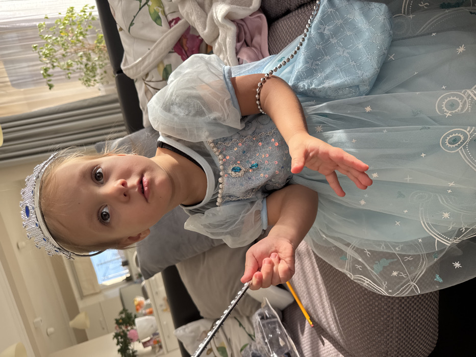 A young child, with fair skin and light hair, is depicted seated on a grey upholstered sofa in a brightly lit indoor environment. The child wears a silver-colored tiara with blue gemstone accents and a light blue princess-style dress featuring puffed sheer sleeves, a bodice with pearl-like trim and blue sequins, and a full skirt with white patterned details. In the child's left hand, a silver-colored wand with clear decorative stones is held. A silver beaded chain is draped from the child's right shoulder, around the right arm, and across the body to a matching light blue fabric pouch on the right hip. The child's gaze is directed forward, with the mouth slightly agape. To the child's left on the sofa, a yellow pencil and clear plastic packaging are visible. The background reveals a domestic setting with a dark sofa, light-colored walls, two ceiling light fixtures, a window with grey curtains, and various decorative elements including potted plants and a bowl of fruit. The specific location within Varna, Bulgaria, is not discernible from the visual information provided.