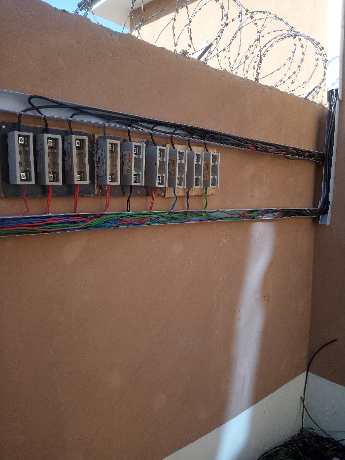 This image depicts an outdoor electrical installation on a light brown, textured wall in Badiko, Nigeria