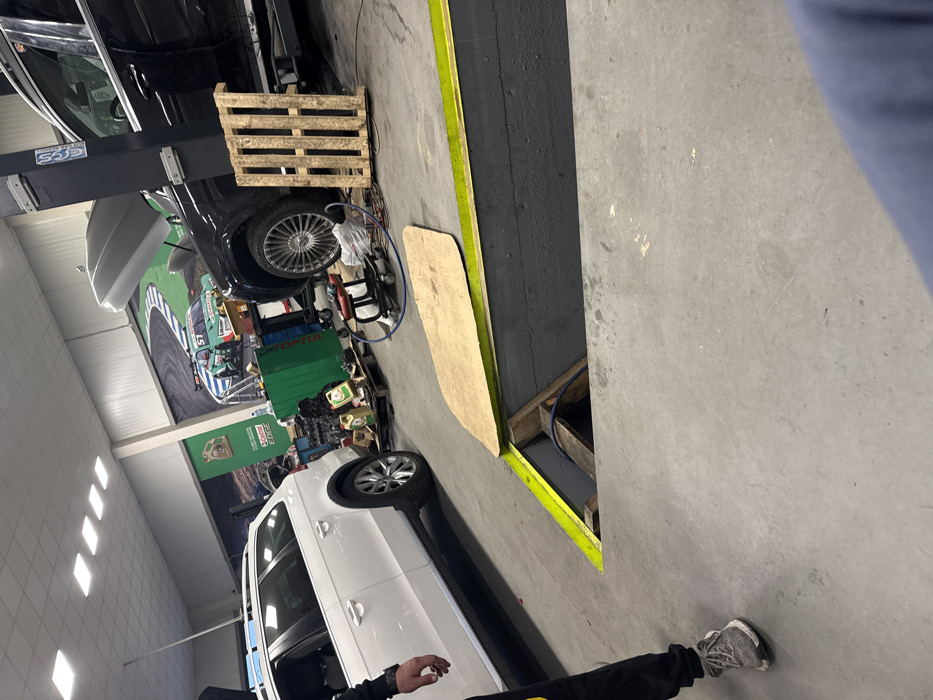 The image depicts an indoor automotive repair shop in Veliko Tarnovo, Bulgaria