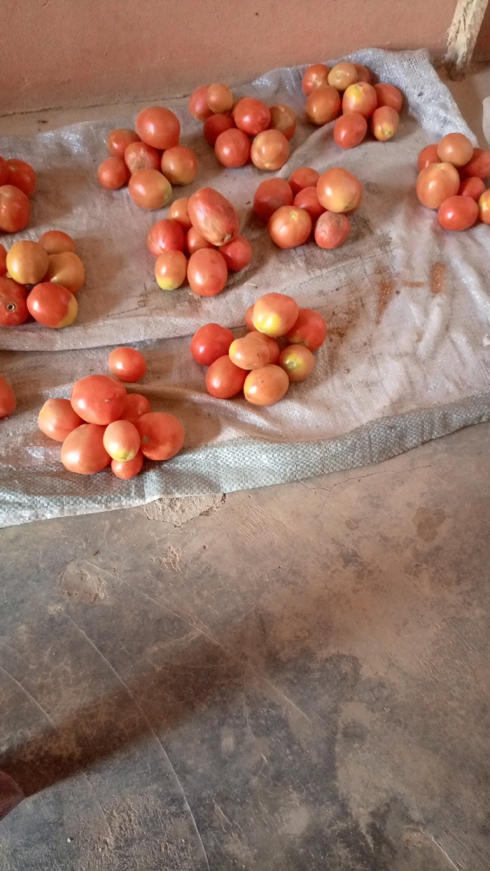 The image displays multiple clusters of tomatoes, varying in ripeness from red to orange and yellowish-green, some with minor blemishes. These tomatoes are arranged on a light grey, woven, coarse fabric or tarp, which covers the upper portion of a dark, worn, concrete or dirt floor. A solid reddish-brown wall is visible in the upper background. No individuals are present, and no active interactions or actions are depicted. The scene is located in Unguwar Saya, Nigeria, presenting a static view of produce likely prepared for sale or storage.
