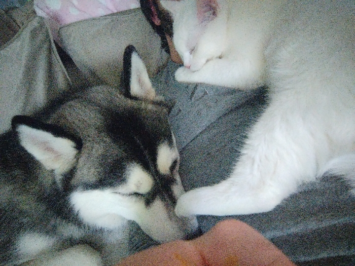 - "A white cat and a husky dog are snuggled together, sleeping" by FM-M4lpO2, licensed under CC BY 4.0
