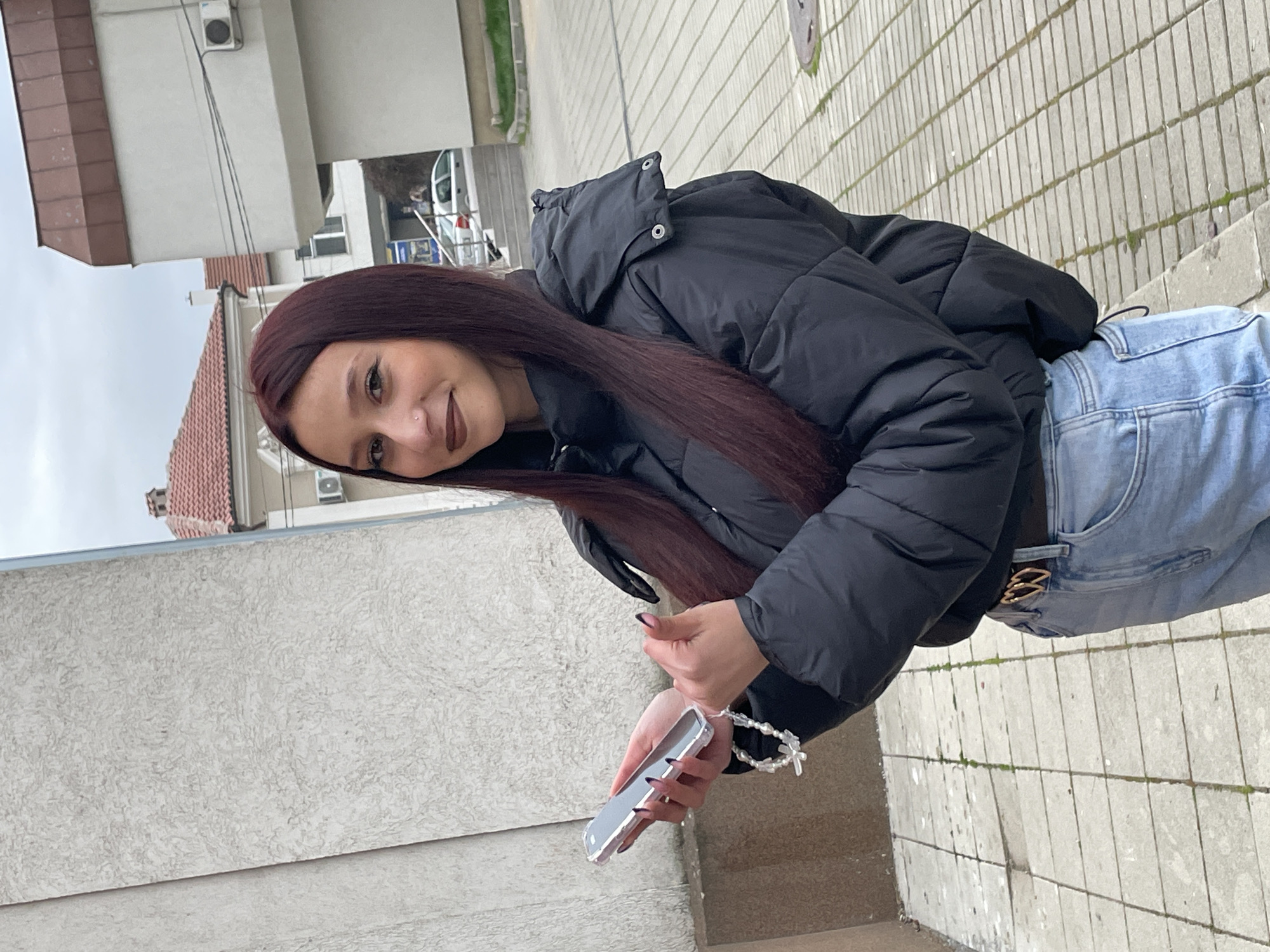 A young woman stands outdoors in Ihtiman, Bulgaria, holding a mobile phone. She wears a black puffer jacket and light blue jeans with a gold belt buckle. She has long, dark red hair and a nose piercing. The backdrop includes a building with a light-colored facade, a roof with red tiles, and a paved walkway. The location appears to be an urban environment.