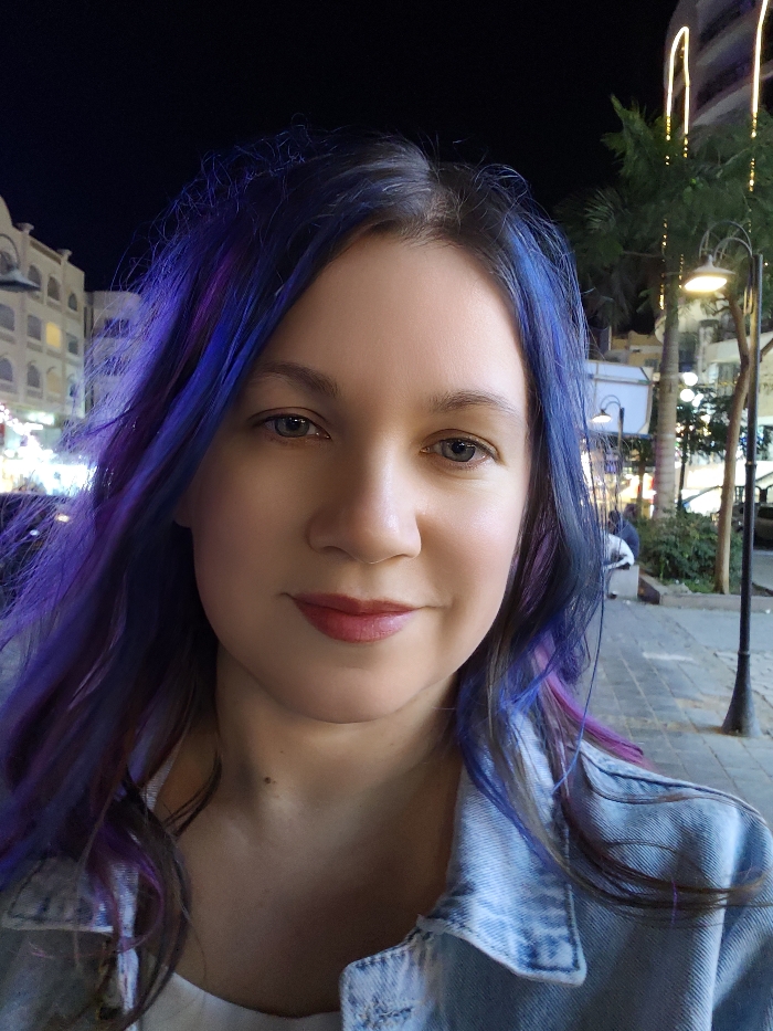 A woman with blue and purple dyed hair smiles at the camera. She wears a light-wash denim jacket over a white top. The background reveals an outdoor scene at night. Buildings and street lights line the backdrop. Palm trees decorated with string lights can be seen to the right. The walkway beneath her is paved with square tiles.