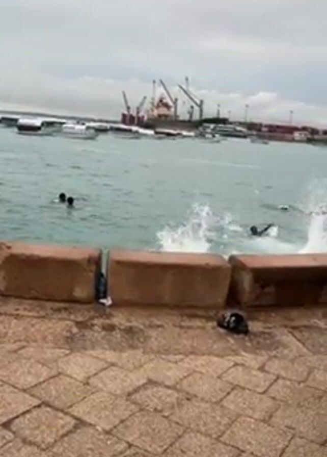 group of people jumping into the water from a concrete wall by the sea. There are several people already in the water, and others are running and jumping in. A crowd of people appears to be watching and cheering. In the background, there are boats and a large cargo ship docked in a harbor. The sky is overcast, and the water is a pale blue-green color. The area surrounding the wall is paved with patterned stone blocks.