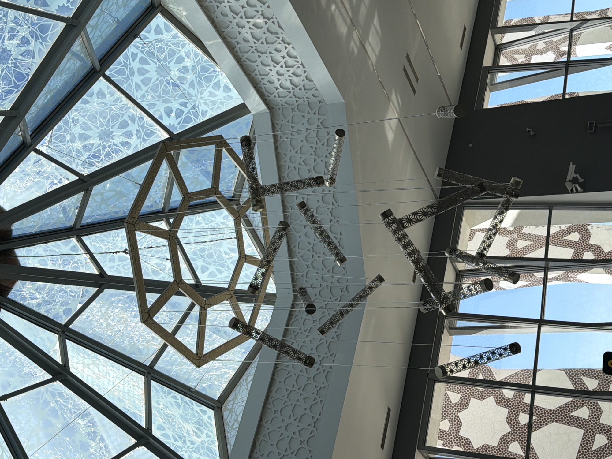 The image displays a modern interior within a building located in Ouled Tayeb, Morocco. The upper portion of the scene is dominated by a large, multi-faceted skylight featuring dark metal framing and translucent glass panels adorned with intricate light-blue geometric patterns against a clear blue sky. Centrally suspended from the ceiling below the skylight is an ornate chandelier. This chandelier consists of a large, skeletal, light-brown hexagonal or octagonal frame from which numerous individual light fixtures descend. These fixtures are elongated, dark cylindrical tubes, each perforated with detailed geometric patterns, hanging at various lengths by thin suspension wires. Below the skylight and chandelier, a light-colored wall section features extensive relief-carved Islamic geometric patterns. Further down, large dark-framed windows are visible, some panes covered with translucent films displaying larger-scale brown, white, and black geometric designs, while others offer clear views of the bright blue sky outside. No individuals, actions, or direct interactions are present in the scene.