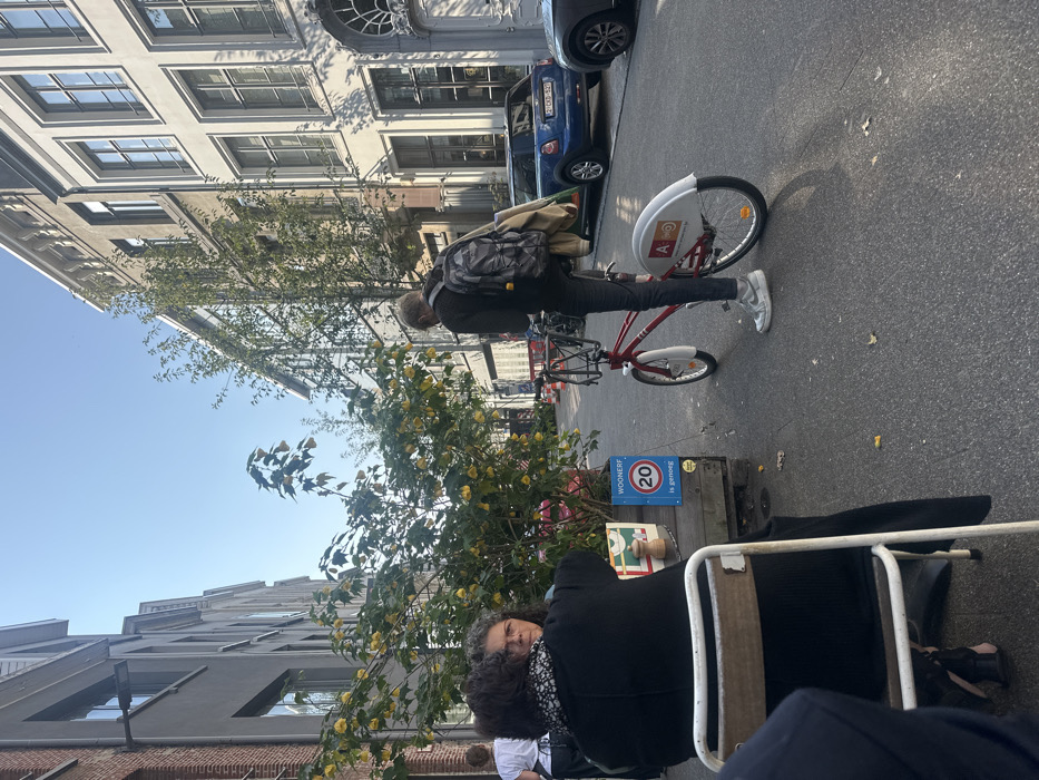The image depicts an urban street scene in Antwerp, Belgium, identified as a "Woonerf" (residential shared space with a "20 is genoeg" or "20 is enough" speed limit sign) by Dutch-language signage and an "A-velo" bike-sharing bicycle. The time of day is sunny with clear skies, casting distinct shadows. In the foreground, left, a person is seated with their back mostly to the camera on a white metal chair, wearing dark clothing. Next to them, a second person with curly dark hair, wearing a dark top and a patterned scarf, is seated at an outdoor establishment and looking towards the camera. They are positioned beside a large potted plant with yellow flowers, within a wooden planter that also displays the "WOONERF" sign. In the midground, right, a third individual with light-colored hair, dressed in a dark hooded top, dark trousers, and light grey Nike sneakers, stands straddling a red "A-velo" bike-sharing bicycle. They carry a grey backpack with yellow accents, over which a beige jacket is draped, and their gaze is directed downwards. The street extends into the background, flanked by multi-story buildings. On the right, parked vehicles include a blue Mini Cooper with Belgian license plate 1-CKG-520, and a dark sedan parked in front of it. The architecture features various window styles and building materials, indicative of a historic urban environment.