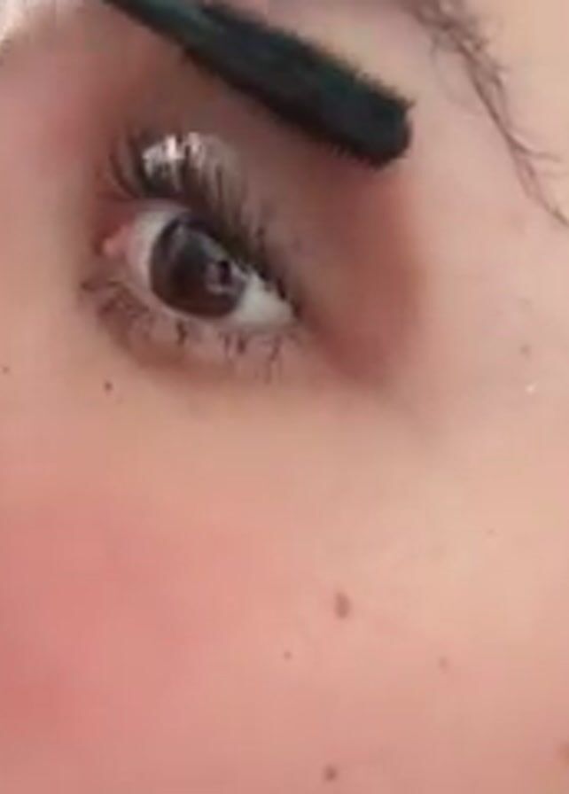 A close-up shot focuses on a person applying mascara to their upper eyelashes with a black mascara wand