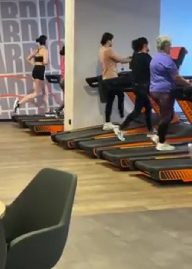 The scene shows several people at a gym, engaged in cardio workouts on treadmills