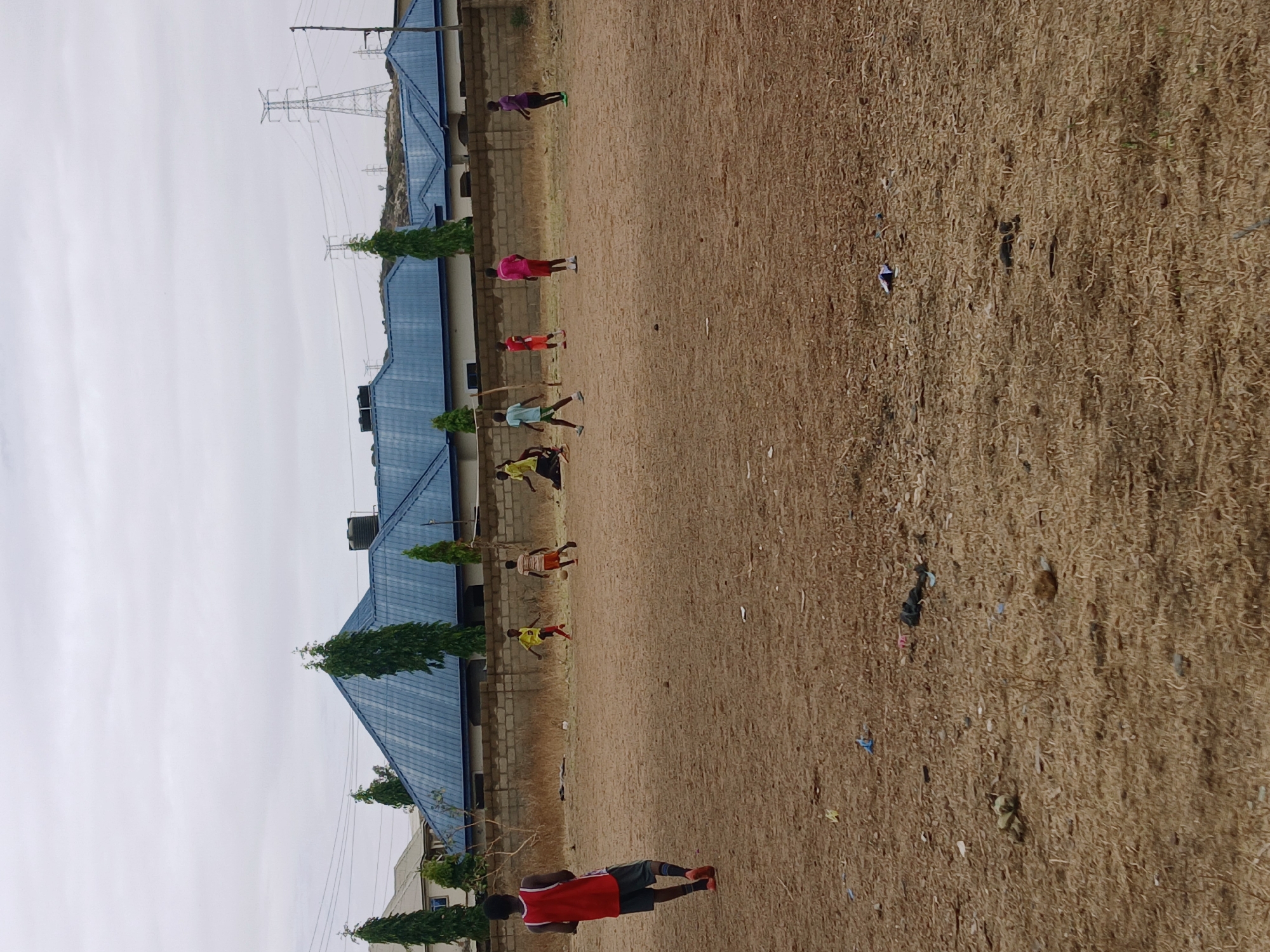 n outdoor scene in Kitwe, Zambia. A group of children are playing on a brown, dry field. The field has scattered litter. Behind them, there is a beige brick wall with a row of buildings having blue rooftops and tall, thin trees. Power lines are visible in the background, set against a cloudy sky. Some of the children are running, while others appear to be standing still. The child closest to the camera is wearing a red shirt with black shorts.