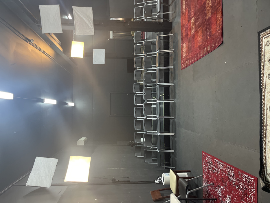 An indoor space with gray walls and floor featuring rows of stacked gray chairs. Carpets, one red and one with beige borders, are on the floor. There are white panels and glowing rectangular lights hanging from the ceiling, illuminating the scene. A doorway is visible in the center background. Additional chairs and equipment sit in the foreground.