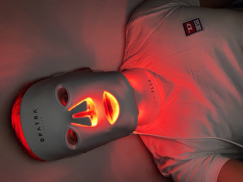 - "A person is depicted from the chest up, wearing a white full-face LED light therapy mask branded "OPATRA LONDON"" by FM-a4EeT2, licensed under CC BY 4.0
