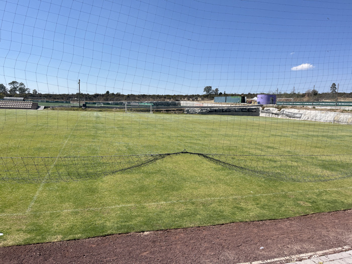 A grassy soccer field is viewed through a black net, slightly obscuring the scene. White lines are visible on the field. In the background, there are stands and a green fence. Further back, storage containers, including a purple water tank, can be seen. Trees are visible in the distance against a clear blue sky with a single white cloud. The foreground shows a dirt or gravel path bordering the field.