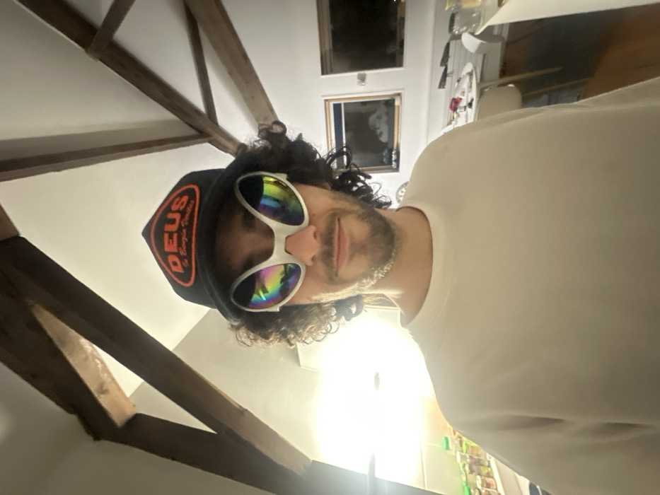 A single male individual is depicted indoors in Carnin, France. The subject has dark, curly hair and facial stubble, wearing a black baseball cap with an orange "DEUS Ex Machina" logo. He is also wearing oversized white-framed sunglasses with iridescent, multi-colored reflective lenses, and a plain light-colored crew-neck shirt. The individual faces the camera with a slight smile. The background shows a white ceiling with exposed wooden beams. To the left, a bright light source generates significant glare, partially obscuring a shelf holding multiple small containers, one with a green lid. To the right, a white wall features two rectangular forms, possibly windows or monitors, and a section of a white circular table with light-colored chairs and various items on its surface. The floor visible beneath the table appears to be wood.