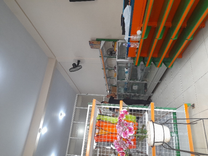 A commercial space presents shelving units packed with merchandise, alongside other shelving with plants. An individual stands near the shelves. A small fan is mounted on the ceiling. Artificial flowers in a white pot are centrally placed. The lighting is a mix of natural and artificial.
