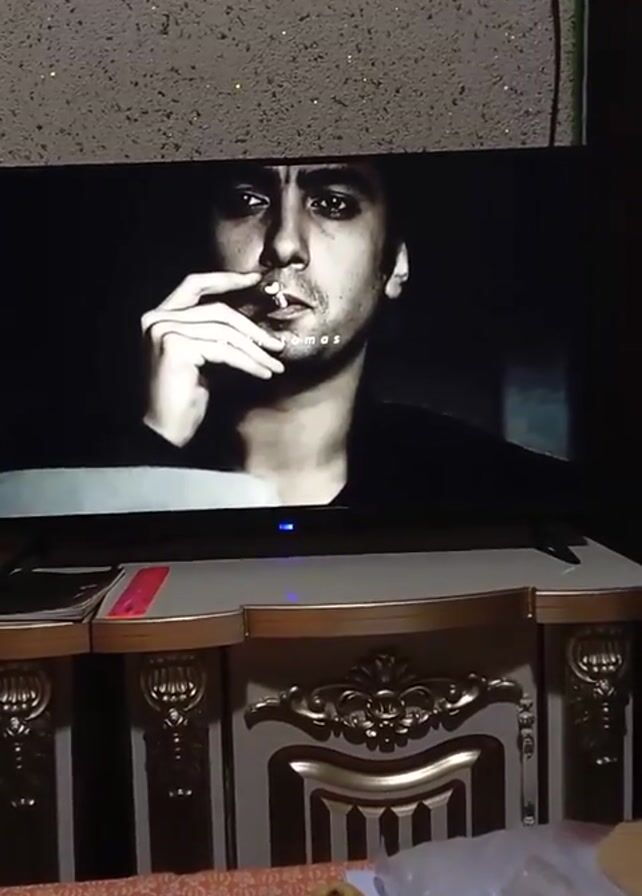 TV screen displaying a black and white image of a man smoking. The man has dark hair and dark eyes, and he is wearing a black shirt. The TV is sitting on top of a white and gold console table. There are some items on the table in front of the TV, including what appears to be a pomegranate, a plastic bag, and some papers. The wall behind the TV is a light gray color with a textured surface.