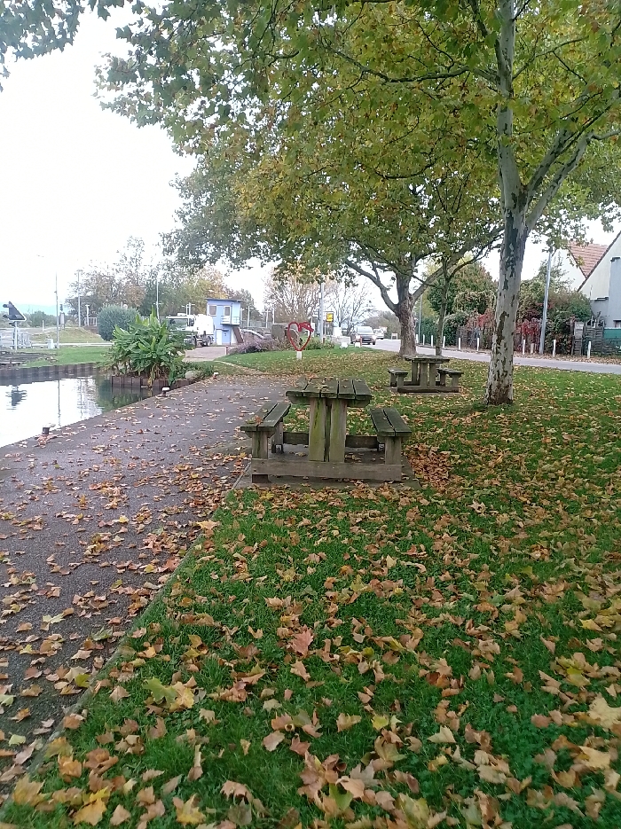 The image depicts an autumnal scene along a canal in Souffelweyersheim, France. In the foreground, a grassy area with numerous scattered brown and yellow fallen leaves occupies the right half. Two weathered, wooden picnic tables with attached benches are positioned on this grass; one is prominently in the foreground, and another is partially visible further back. To the left of the grassy area, a paved path, also covered in fallen leaves, runs parallel to a canal of still water. In the midground, several mature trees, exhibiting mostly green to yellowing foliage, provide shade over the picnic tables and path. Their trunks feature mottled grey and white bark. The background shows a lock system on the canal. A small, light blue utility building is visible near the canal bank, to the left of which appears a green truck and a canal lock mechanism. A red, heart-shaped metal sculpture is located on a small embankment near the blue building. A road with a few vehicles and a yellow sign (possibly a commercial advertisement) runs parallel to the canal further in the distance. The sky is overcast, indicating a cloudy daytime environment. No individuals are present in the scene.
