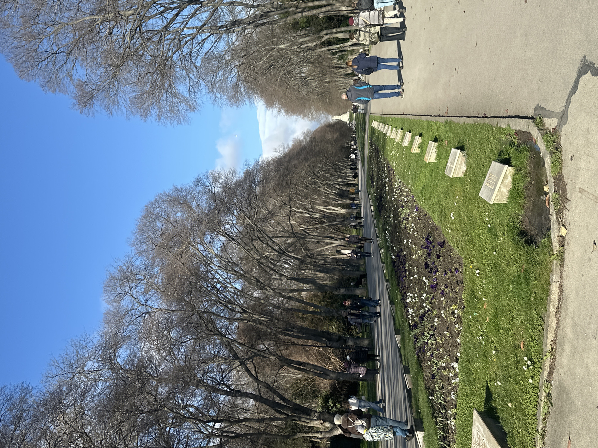 The image depicts a wide, tree-lined avenue within the Sea Garden (Morska Gradina) in Varna, Bulgaria, under a clear blue sky with scattered white clouds. The scene is observed during late autumn or early spring, evidenced by the numerous deciduous trees lining the paths, which are bare of leaves. Two parallel concrete or asphalt pathways extend into the distance, converging towards a white monument or structure. These pathways flank a central grassy median. The median features a cultivated flowerbed in the foreground, containing small white and purple flowers amidst dark soil, bordered by areas of green grass with scattered white blossoms. Embedded periodically along the edge of the median adjacent to the right pathway are several small, rectangular, light-colored stone markers or plaques. Approximately twenty-five to thirty individuals are visible, distributed across both pathways. Most are walking, singly or in small groups. They are dressed in casual outerwear such as jackets, coats, and long trousers, suggesting cooler weather. Their postures indicate pedestrian movement, with no overt interactions. The sunlight casts distinct shadows, particularly from the trees and individuals, suggesting a mid-day lighting condition.
