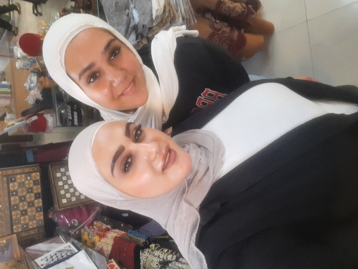Two adult females are positioned in an indoor retail environment, likely a shop or market stall, located within Barza Municipality, Syria