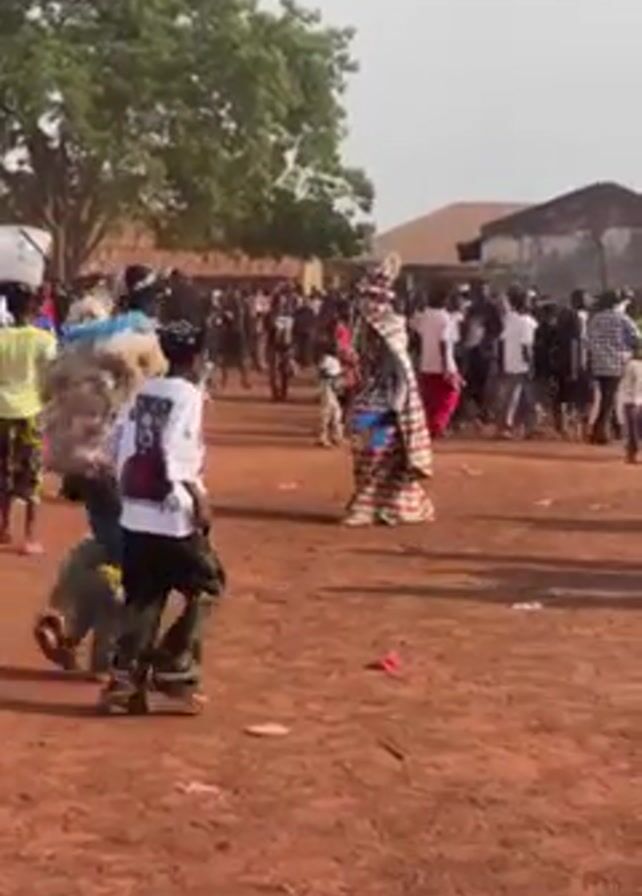 The video depicts a crowded outdoor scene, likely a cultural event or celebration, taking place on a red dirt field. People of various ages and attire are visible, including some in elaborate costumes or masquerade outfits. These costumes are vibrant and traditional, featuring materials like fabric strips and straw. The crowd includes adults and children, with some individuals walking while others are gathered. The surrounding environment includes trees, buildings, and a clear sky. There's a sense of movement and activity as the masqueraders move around the field among the onlookers.