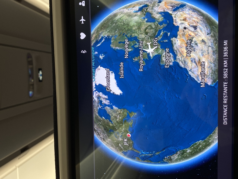 The image displays an in-flight entertainment screen from a passenger's perspective within an aircraft cabin. The screen shows a digital globe centered on the North Atlantic, with a white airplane icon positioned over Charles de Gaulle Airport (CDG), which is located in Le Mesnil-Amelot, France. A red marker labeled "JFK" indicates John F. Kennedy International Airport in North America. A text overlay at the bottom of the screen reads "DISTANCE RESTANTE : 5852 KM | 3636 MI," indicating the remaining flight distance from CDG to JFK. Visible country labels in French include Groenland, Islande, Norvège, Royaume-Uni, Espagne, Algérie, and Mauritanie. The upper portion of the image shows the illuminated interior overhead panel and ceiling of the aircraft cabin.