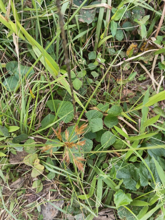The image displays a close-up, overhead view of dense ground vegetation in Chengdu, China. The scene is dominated by various green plant species, including numerous tall, slender grass blades and broad-leaved plants, some exhibiting a lighter green while others are darker. Prominently featured near the center is a plant with a star-shaped cluster of reddish-brown, spiky inflorescences, characteristic of a sedge species. Scattered throughout the undergrowth are smaller, rounded green leaves of a ground-cover plant. The ground beneath the foliage consists of visible patches of dark soil and dried plant debris. No individuals, animals, or man-made objects are present. The lighting is natural and diffuse, suggesting an outdoor environment.