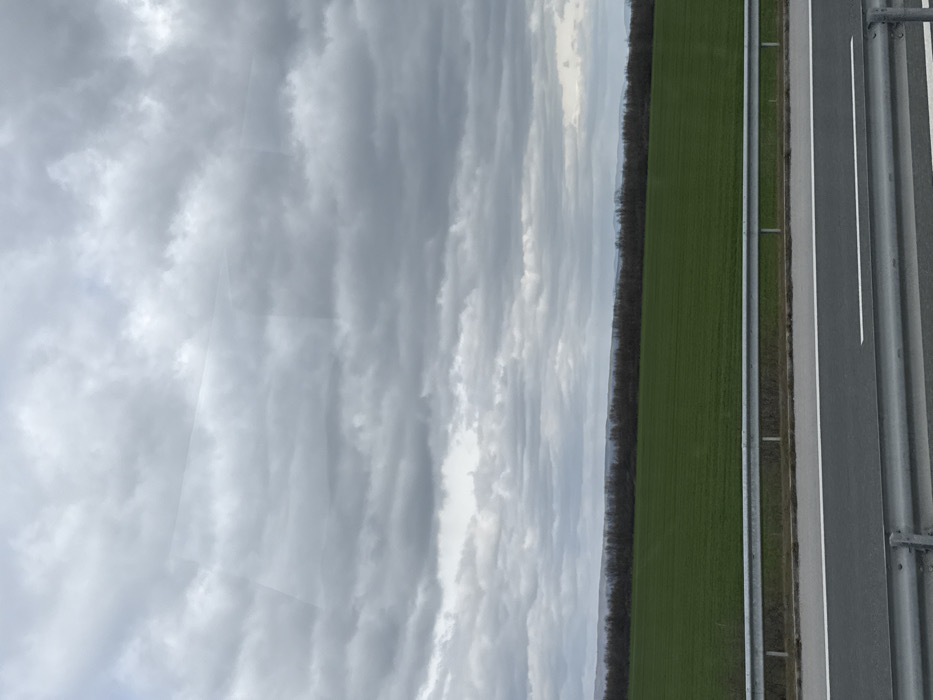 The image displays a rural landscape near Vodenichane, Bulgaria, under a uniformly overcast sky filled with dense, dark grey stratocumulus clouds. In the immediate foreground, a grey metal guardrail extends horizontally, partially obscuring a multi-lane asphalt road with clear white lane markings (one solid, one dashed). Another, lighter grey guardrail is visible on the far side of the road, bordering a narrow strip of uncultivated ground. Beyond the road and its guardrail, a vast, flat expanse of vibrant green agricultural field dominates the midground, exhibiting faint parallel lines indicative of cultivation. This field is terminated by a horizontal band of bare, dark-barked deciduous trees. In the distant background, faint, undulating hills or low mountains are discernible above the tree line. No individuals, animals, or vehicles are present in the scene. Rectangular and linear reflections, consistent with an interior view through a window, are superimposed over the sky and distant background elements in the upper portion of the image.