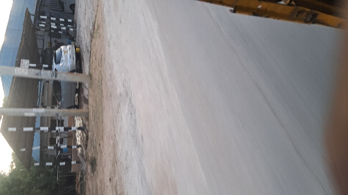 A tilted snapshot reveals a roadside scene, with a gray car parked beside a building framed by striped poles. The composition is dominated by a light gray road stretching towards the right side of the frame, and a blurry yellow object intrudes from the top right corner. Green vegetation peeks from the bottom left, contributing to the mix of urban and natural elements in this casual outdoor capture.