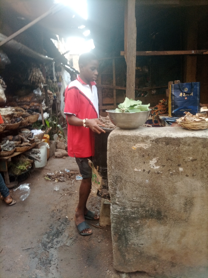 A young man in a red and white shirt stands beside a concrete stand with a metal bowl filled with green leaves. To the left, a person's legs are visible, wearing sandals. The surrounding area appears to be a market stall with various items displayed on shelves and the ground littered with debris. In the background, there's a dark, cluttered interior, and a blue bag with Chinese characters on it. The overall setting is outdoors, with a bright light shining from above.