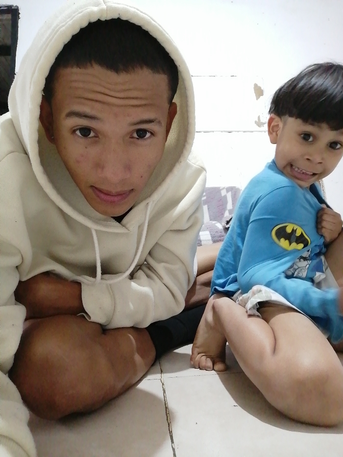 - "A young man wearing a white hoodie sits on the floor next to a child" by FM-fnOaw2, licensed under CC BY 4.0