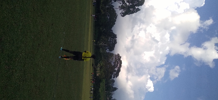 A sprawling green field occupies the left frame, where a person in yellow stands. In the background, several trees and a group of individuals cluster. The right of the frame features a bright blue sky partially obscured by billowing white clouds. The image is horizontally oriented with the sky and clouds seeming to be upside down.