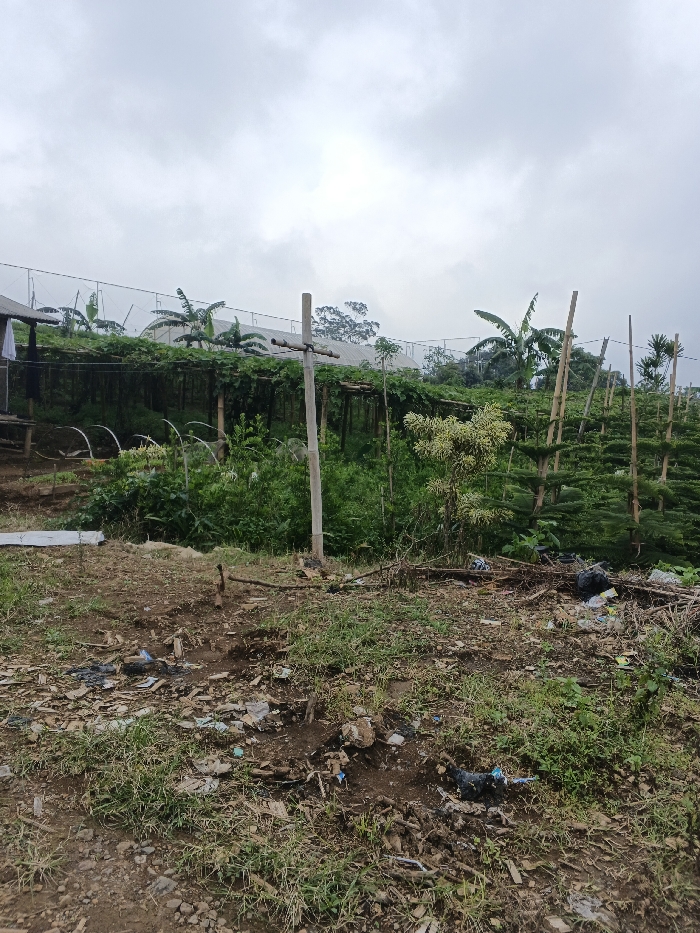 A partly overcast outdoor scene showcases a plot of land featuring varied vegetation. Lush green plants are abundant, with taller plants supported by wooden poles. A structure, possibly a greenhouse, is visible in the background, surrounded by fencing. The foreground reveals disturbed soil with scattered debris, suggesting human activity or environmental impact. The overall impression is of a rural or agricultural setting with signs of both cultivation and neglect.