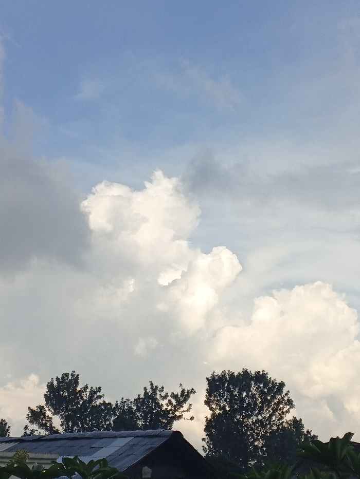 The image presents a daytime scene in Akshatau, Kazakhstan, primarily focused on the sky and elements of the immediate environment below. The upper two-thirds of the frame are occupied by a partially cloudy sky, featuring light blue patches interspersed with prominent, voluminous white cumulus clouds. Some clouds exhibit bright illumination from direct sunlight, contrasting with areas of darker grey cloud cover. In the lower third of the image, the dark silhouettes of several trees are visible, with dense foliage extending upwards into the cloudscape. Beneath the trees, portions of two structures are discernible: a corrugated metal roof, grey in color, spans the lower-left to mid-bottom of the frame, alongside a darker-toned roofline partially visible to its right. No individuals, specific actions, or interactions are present in the scene.