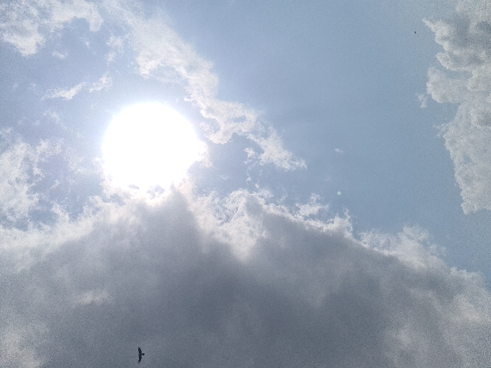 - "This image captures a daytime sky over Unknown, Unknown, featuring a bright sun, various cloud formations, and a single bird in flight" by FM-pSG9r2, licensed under CC BY 4.0