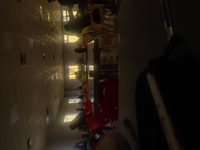 This image depicts the interior of a dining hall or cafeteria located in Jibb as-Safa, Syria. The scene is characterized by dim interior lighting contrasted with strong natural light entering from multiple rectangular windows along the far wall, creating a heavily backlit environment. Numerous individuals are seated at various rectangular tables arranged in rows throughout the room. Due to the backlighting, most people appear as dark silhouettes, making individual features, specific actions, or interactions largely indistinguishable. Some individuals appear to be engaged in conversation or looking towards others at their tables. The tables are primarily rectangular, some featuring metallic or reflective surfaces. Seating consists of a mix of red and yellow plastic chairs. The ceiling is a suspended acoustic tile grid with integrated square fluorescent light fixtures, some of which are illuminated, and several rectangular air vents. The walls are light-colored. In the immediate foreground, a dark, flat surface, consistent with a tabletop, is visible. On this surface, a blue and silver pen is present, alongside a partial view of an indistinct dark object, possibly a bag or electronic device. No specific food items or clear detailed activities are discernible within the visible areas.