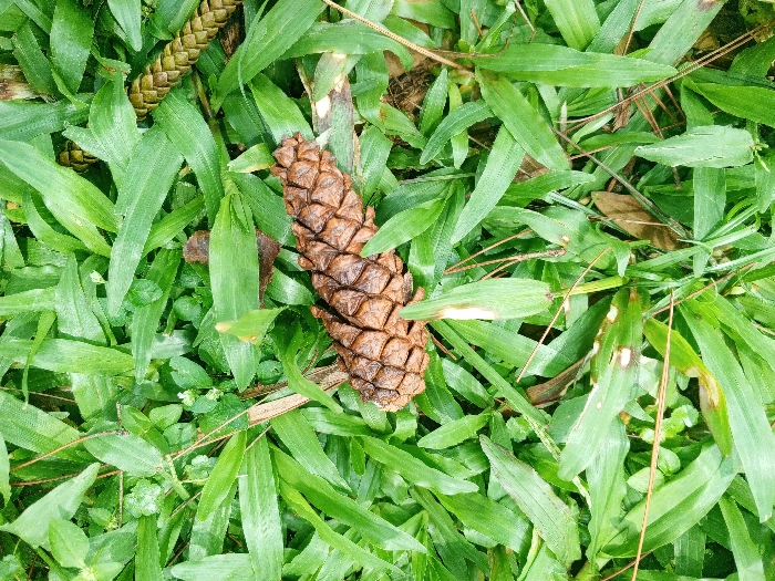 A close-up shot reveals a scene of nature. Lush, vibrant green grass blades dominate the frame, interspersed with smaller, clover-like plants. Resting among the foliage are two pine cones, one whole and brown, exhibiting a rough texture from its scales, and a portion of the other visible at the top of the image. A few stray pine needles and dried leaves lie scattered, adding a touch of muted color to the scene.