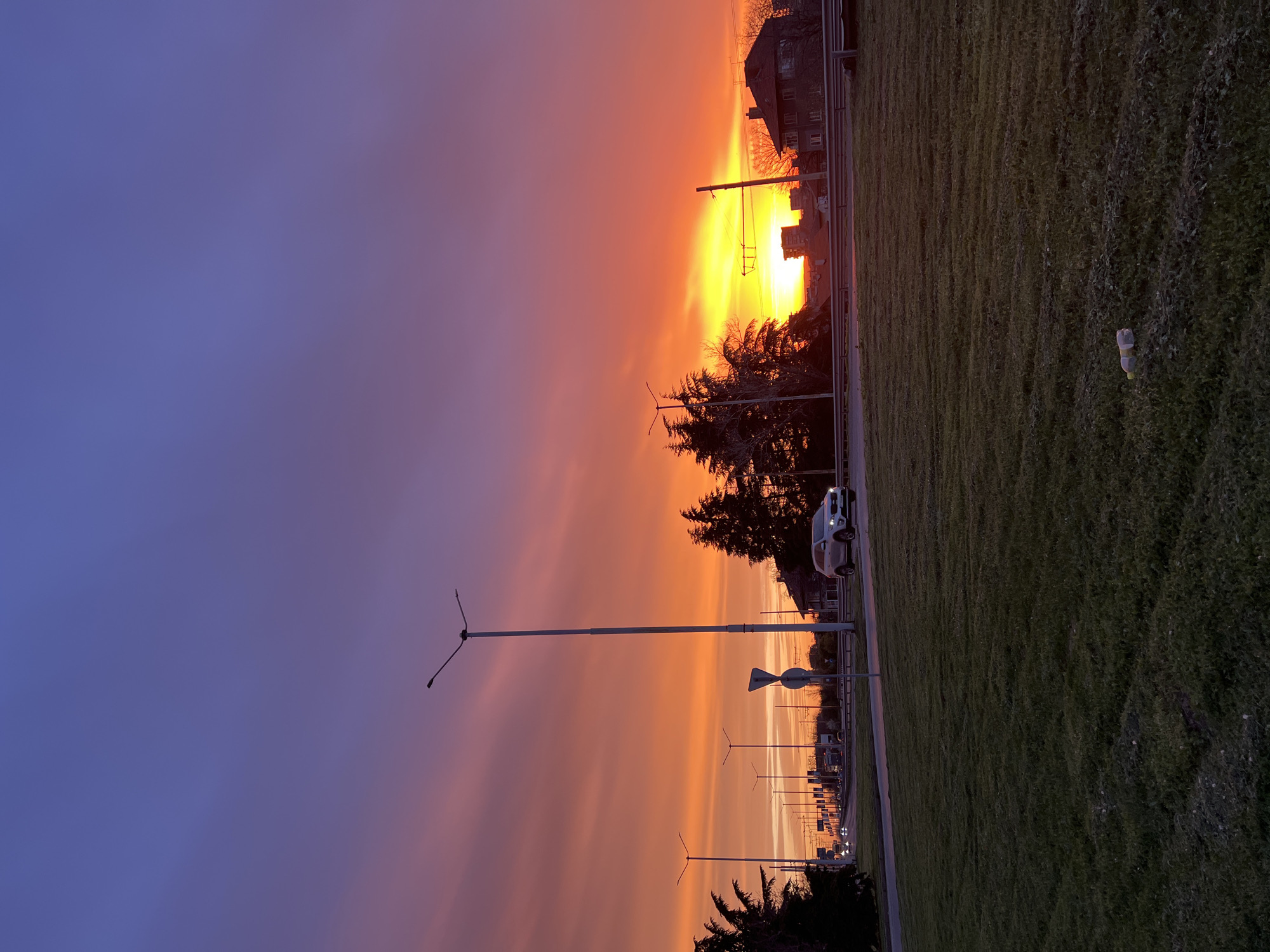 The image is a landscape photo taken during a vibrant sunset in what appears to be a suburban area of Ruse, Bulgaria. The sky is a gradient of deep blue to vibrant orange and yellow where the sun is setting behind trees and buildings. Several streetlights line the road, which is adjacent to a grassy field. A white van is parked on the road. In the grassy field there is a discarded bottle. Buildings are visible in the distance. A white van is parked along the side of the road. The image seems to be taken from a low angle.